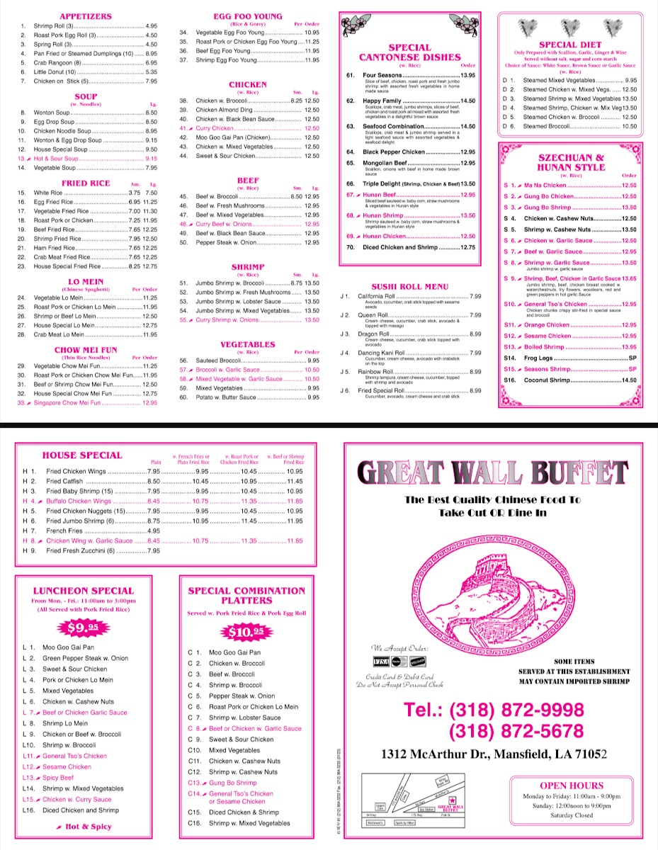 Welcome to Great Wall Buffet, a hidden gem located at 1312 McArthur Dr in Mansfield, LA. Here, you’re invited to embark on a culinary journey featuring a diverse menu that reflects the rich flavors of Asian cuisine.